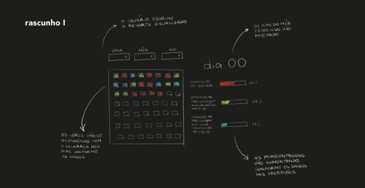 No primeiro rascunho, Julia pensava em uma visualização interativa onde o leitor pudesse escolher a região da cidade (zona), mês e ano para explorar os resultados. Ao selecionar estas informações, uma animação se seguiria mostrando os dados ao longo dos dias do mês. Contudo, essa visualização apresentava alguns problemas, como a dificuldade de coleta de dados em localidades exatas (próximo a hospitais e creches) e lidar com probabilidades muito difíceis de serem calculadas.