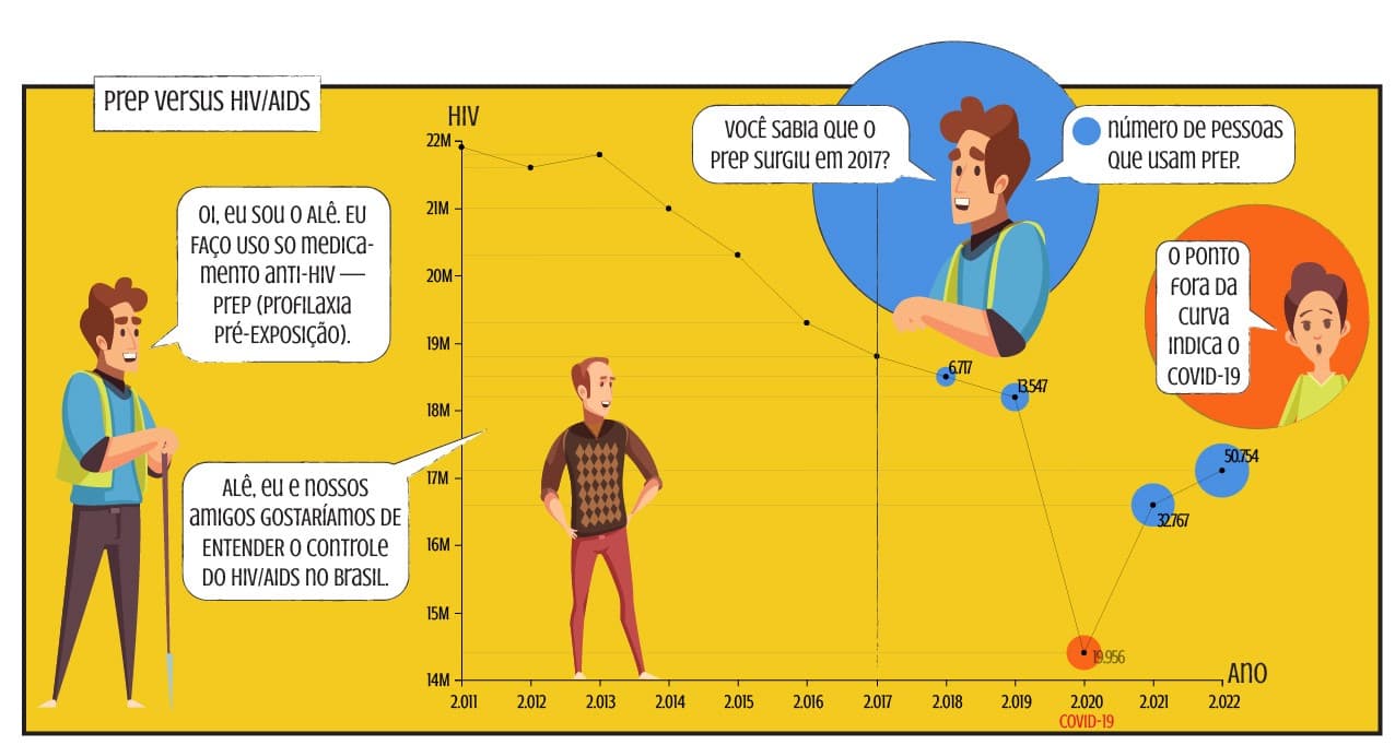 Durante a disciplina de Visualização Criativa de Dados, o estudante de mestrado Alberto de Lima desenvolveu, a partir de questionamentos pessoais, uma Data Comic (História em Quadrinhos) a respeito do uso de PrEP (Profilaxia Pré-Exposição) e o número de pessoas infectadas pelo vírus HIV. O estudante empregou dados de sites do Governo Federal e de organizações como a UNAIDS. Após o tratamento dos dados, Alberto criou uma história em quadrinhos com o objetivo de transmitir as informações de forma divertida e clara . A disciplina de Visualização Criativa de Dados foi ministrada pela professora Doris Kosminsky na Escola de Belas Artes da UFRJ em 2024.1.