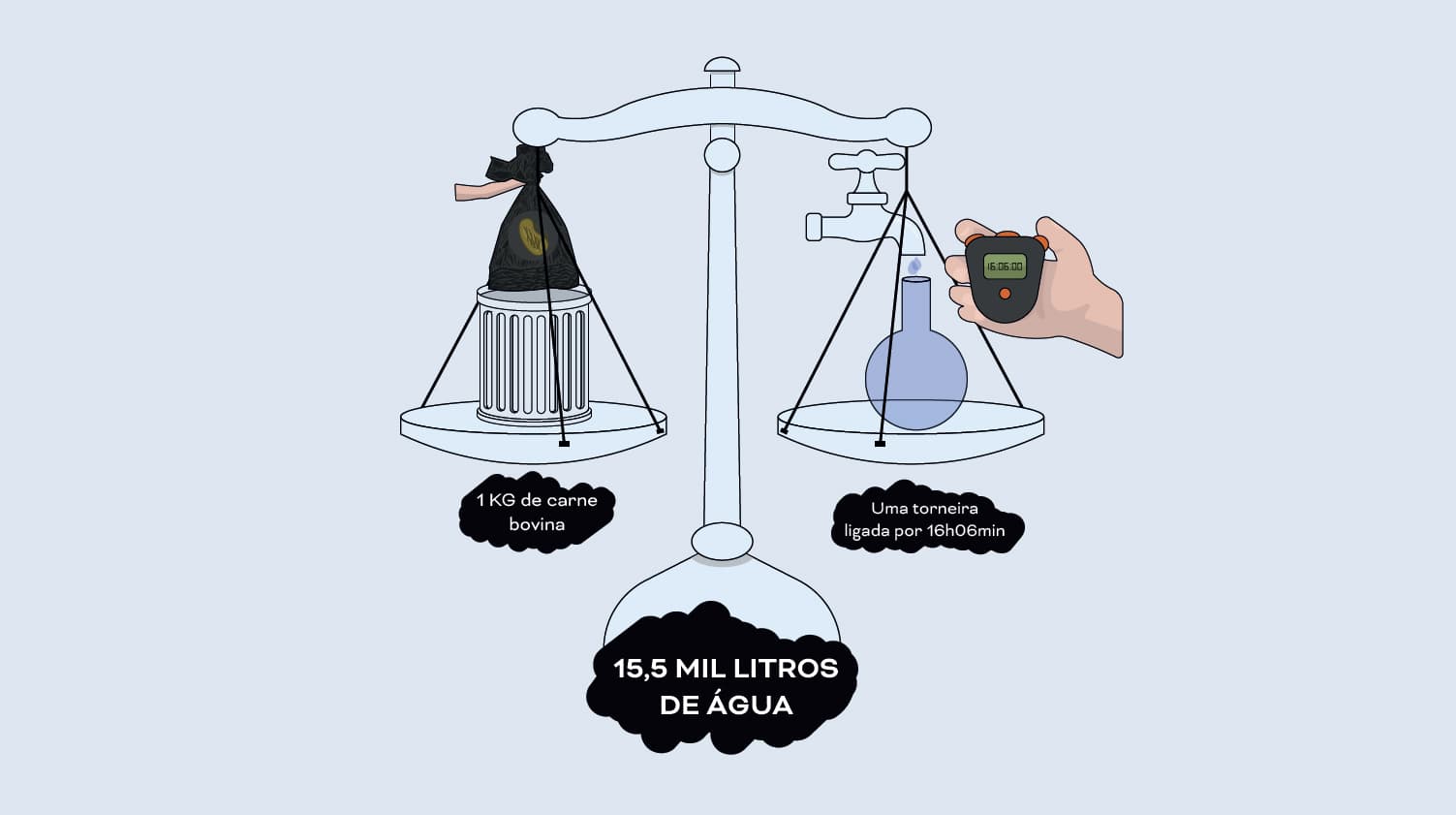 O consumo de água pelo agronegócio brasileiro tem dados assustadores, porém muitas vezes não são transmitidos claramente à população. Buscando uma forma de conscientização sobre a disparidade entre o gasto de um cidadão médio e o consumido mundialmente por bovinos, Vinicius usou dados da FAO-OMS para criar uma visualização que faz a relação de consumo da água com o tamanho de objetos e distâncias.