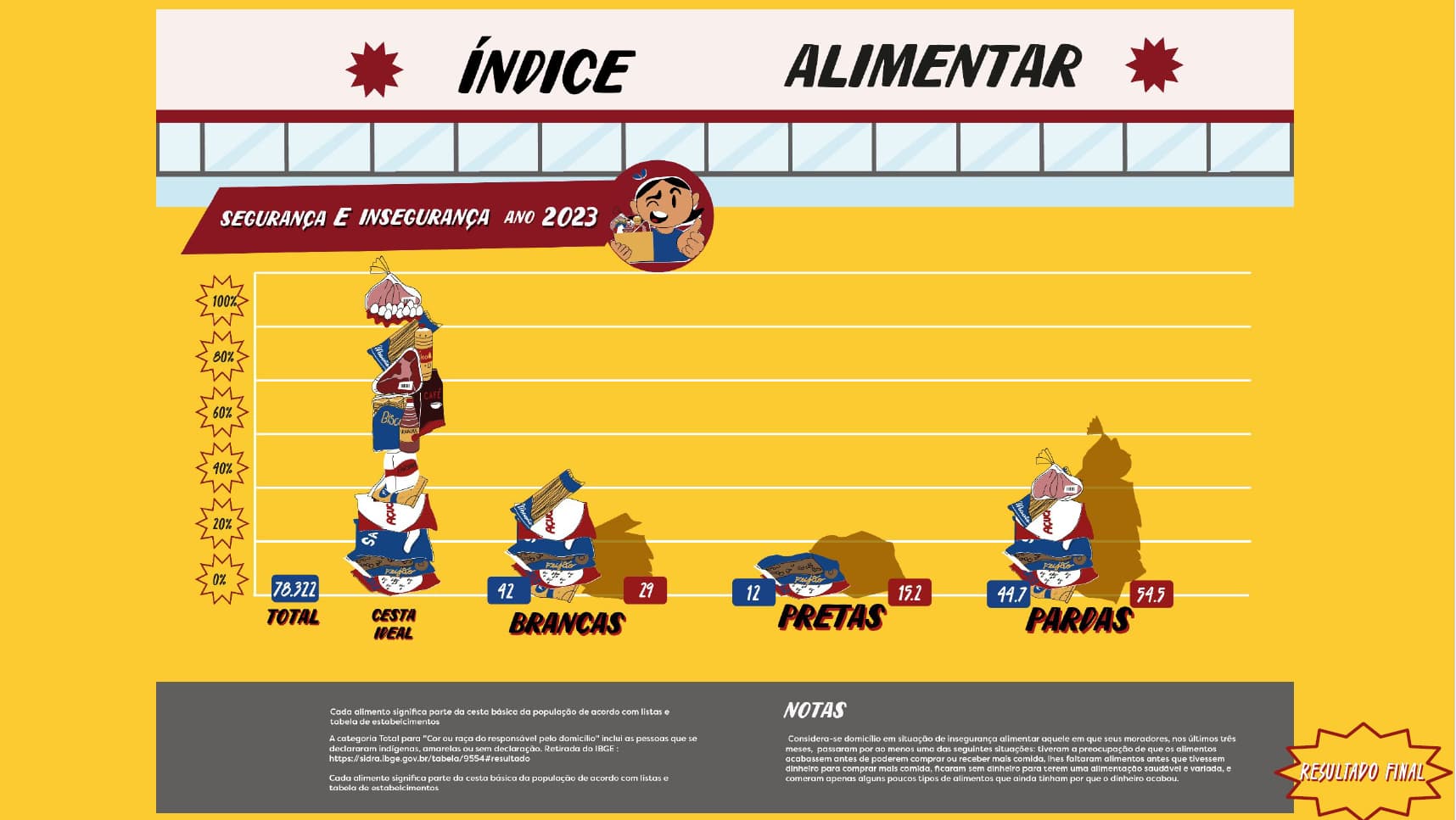 Utilizando dados do IBGE, Izabour e Poliana decidiram tratar sobre a segurança e insegurança alimentar, explicitando parâmetros importantes para melhor entendimento de recortes sociais, como a cor ou raça do responsável pelo domicílio e ilustrá-los de forma acessível ao público alvo, utilizando um visual de cartazes e encartes de mercado.