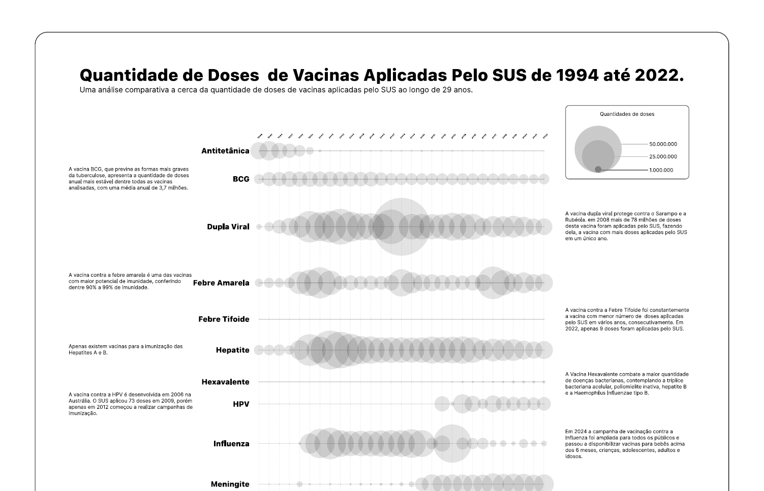 Após uma coleta de dados pela plataforma datasus, Gabriel identificou a necessidade do gráfico em contemplar as principais variáveis: ano, nome da vacina e a quantidade de doses aplicadas, com isso em mente optou pelo gráfico em bolhas sobrepostas. Tomou a decisão de uma composição monocromática pensando no custo da impressão, que requer uma folha A0 devido à riqueza de informações e considera o local que será exposta.