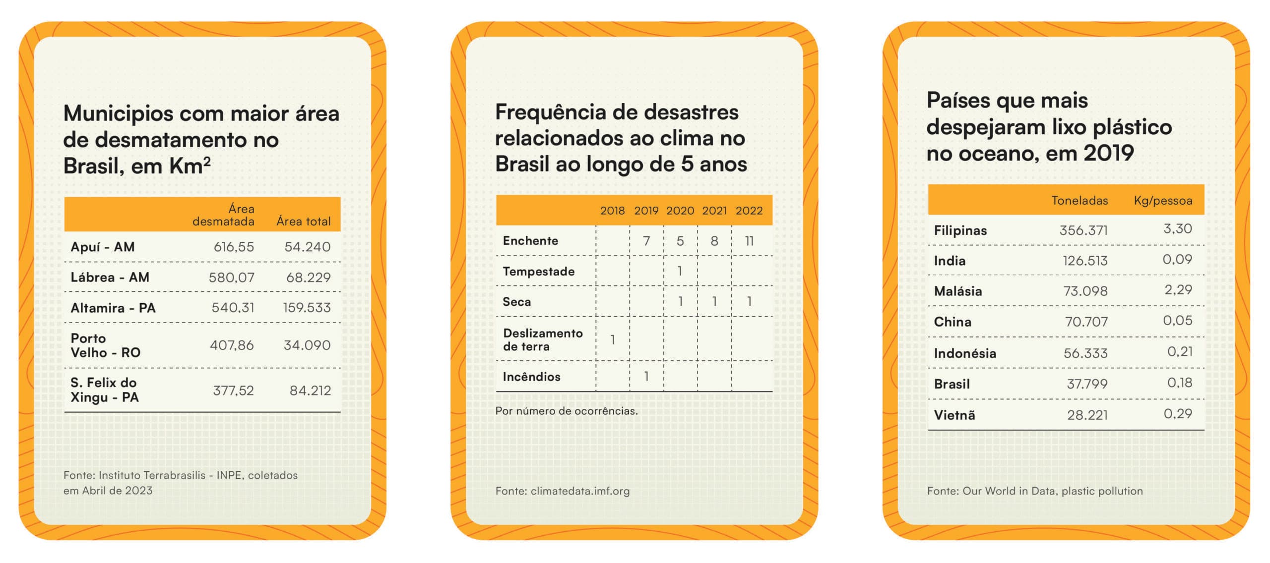 As cartas de dados são usadas no jogo para possibilitar a criação de visualizações. Foram coletados dados sobre os temas relacionados ao meio ambiente como desmatamento, descarte de plástico e poluição do ar. Já as cartas verdes são as visualizações com o seus respectivos nomes, elas servem como guia de resposta na formação dos pares