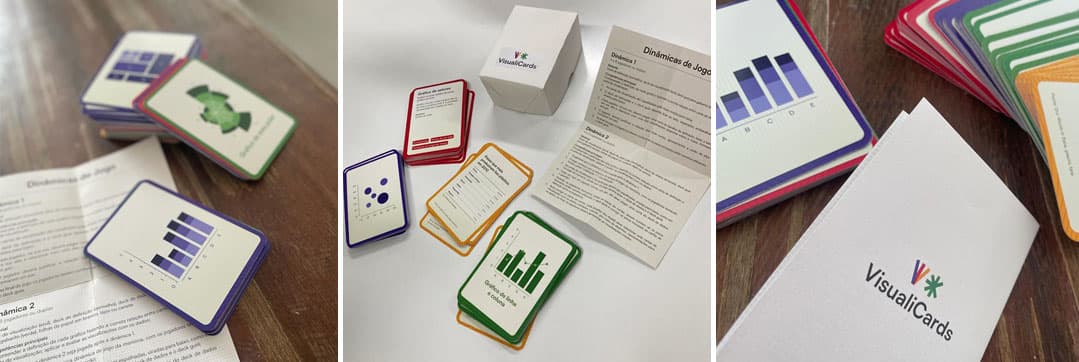O projeto de elaboração do jogo VisualiCards buscou incentivar o letramento (literacia) em visualização de dados por meio de metodologias criativas. Como resultado desse processo foi criado o jogo de cartas composto por 4 decks (baralhos) contendo um total de 90 cartas com visualizações, definições, cartas-resposta e carta de dados. Nosso objetivo é apresentar as características dos gráficos que podem ser usados para representar dados e incentivar a compreensão e criação de visualização de dados.
