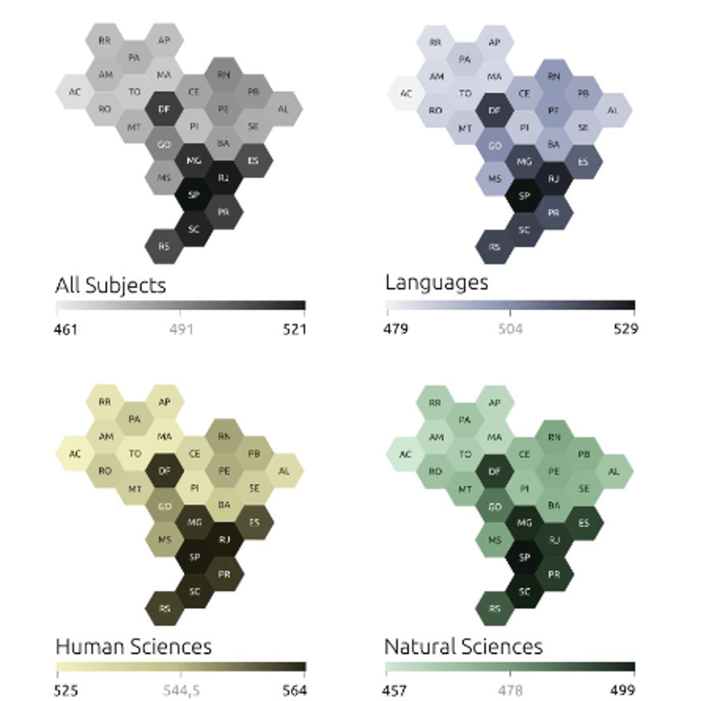 A popularidade e disponibilidade de ferramentas digitais impulsionaram o uso de mapas temáticos em infográficos e visualizações de dados. Ao contrário dos mapas de uso geral, os mapas temáticos têm como objetivo comunicar a distribuição espacial de um determinado tópico ou tema, como densidade populacional, preferência do eleitor ou renda. Como os mapas temáticos têm sido mais frequentemente estudados e adaptados para países europeus e norte-americanos, alguns deles precisam de ajustes para representar adequadamente os estados brasileiros, de acordo com suas necessidades. O objetivo deste artigo é apresentar o cartograma hexagonal hierárquico, que representa os estados brasileiros em um formato geográfico normalizado usando escalas de cores de um único tom para mostrar a magnitude. Demonstramos seu uso mapeando as notas médias obtidas por alunos de todos os estados brasileiros em um exame nacional denominado ENEM (Exame Nacional do Ensino Médio).