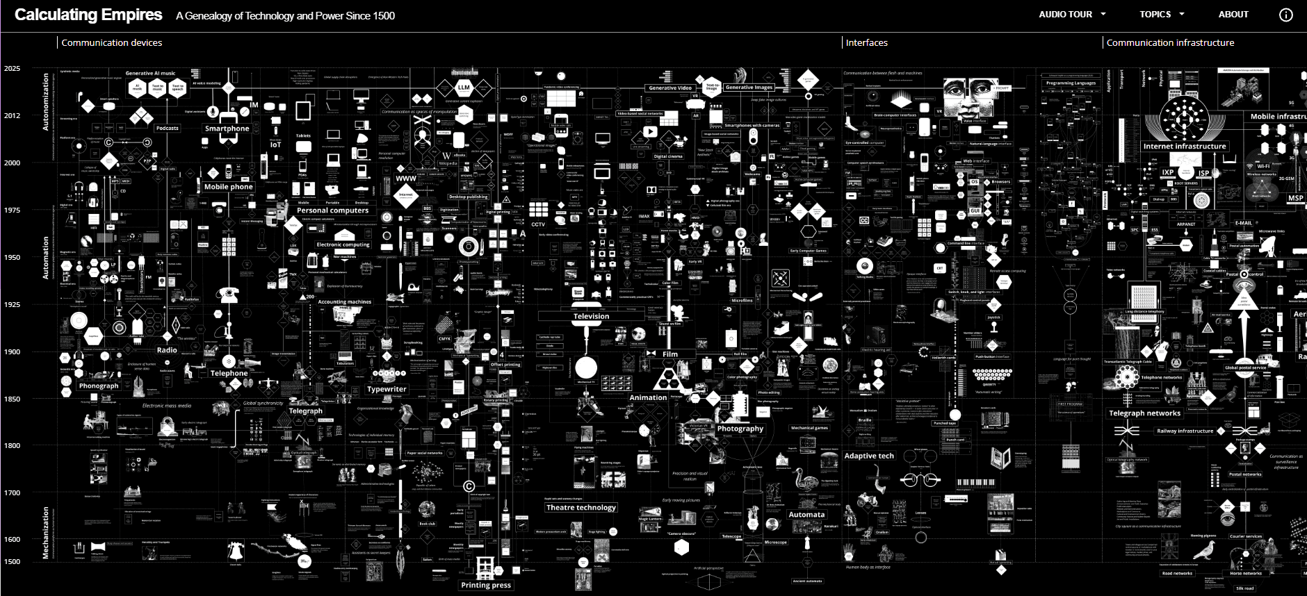 Calculating Empires (em livre tradução: Calculando Impérios), é uma visualização de dados exploratória em larga escola que busca colocar o período contemporâneo sob a perspectiva do longo processo histórico das ideias, infraestruturas, tecnologias e sistemas de poder que nos trouxe até aqui. Os autores selecionaram dados desde 1500 para rastrear o caminho que os diferentes impérios trilharam e, principalmente, demonstrar como seu poder ainda hoje nos subjuga.