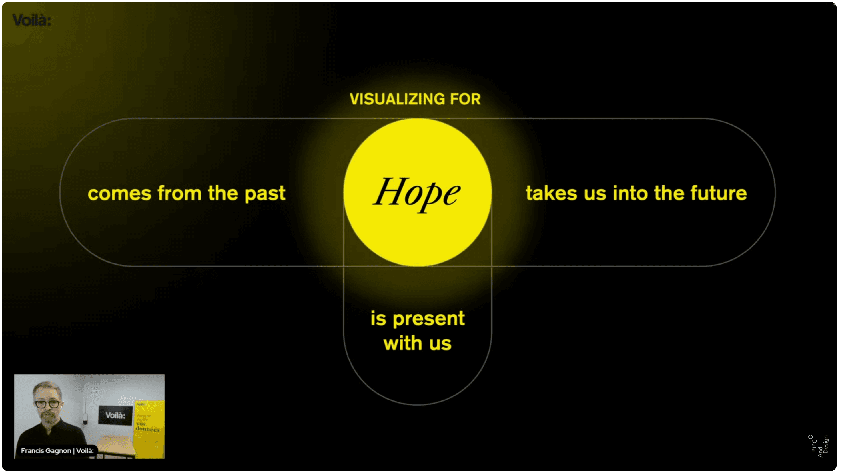 Francis Gagnon demonstrou como o design da informação pode revelar esperança ao ao analisar o progresso no passado, as oportunidades no presente e as "vitórias rápidas" (quick wins) e melhores caminhos para um futuro melhor. Ele enfatizou que a esperança é uma responsabilidade e apresenta exemplos concretos de como boas notícias e contraexemplos podem ser encontrados nos dados.