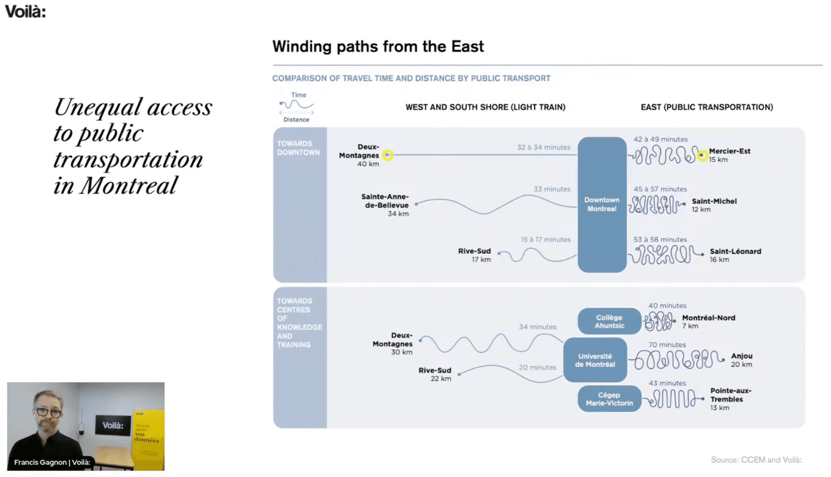 - Rompendo com Padrões: A apresentação vai além dos gráficos de linha tradicionais, exibindo visualizações que comunicam a mensagem de forma impactante. Um exemplo notável é o gráfico que mostra o acesso desigual ao transporte público em Montreal, onde a distância e a sinuosidade das linhas representam o longo "caminho sinuoso" (winding path) que o usuário precisa percorrer, evidenciando a ineficiência e a oportunidade de melhoria [09:39].