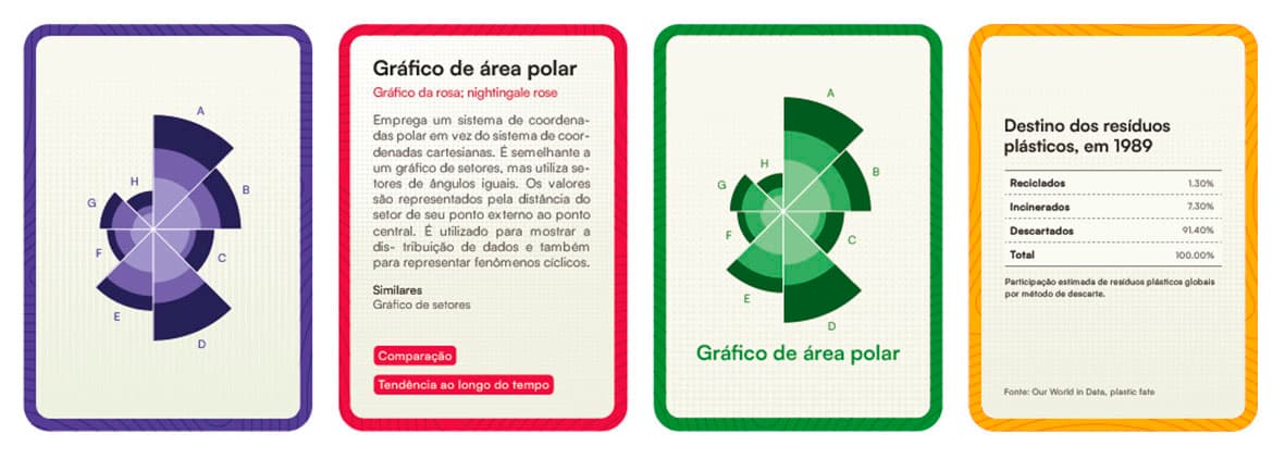 As cartas de dados são usadas no jogo para possibilitar a criação de visualizações. Foram coletados dados sobre os temas relacionados ao meio ambiente como desmatamento, descarte de plástico e poluição do ar. Já as cartas verdes são as visualizações com o seus respectivos nomes, elas servem como guia de resposta na formação dos pares